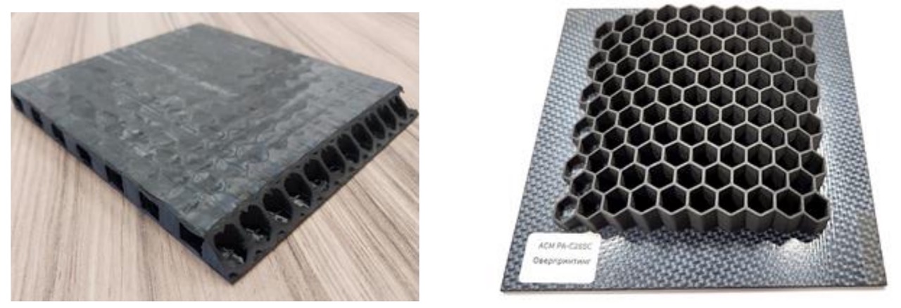 - Технологию изготовления трёхслойных панелей с сотовым заполнителем (сотопанель) и подкреплённых панелей (стрингерная панель) методом оверпринтинга.